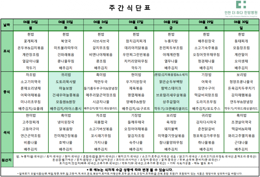 [더하다 식단] 2024년 6월 5주차 식단 작성일 : 2024.06.21 인천더하다한방병원 댓글 : 0 조회 : 805 <인천더하다한방병원 6월 4주차 식단사진> <인천더하다한방병원 6월 5주차 주간식단표>