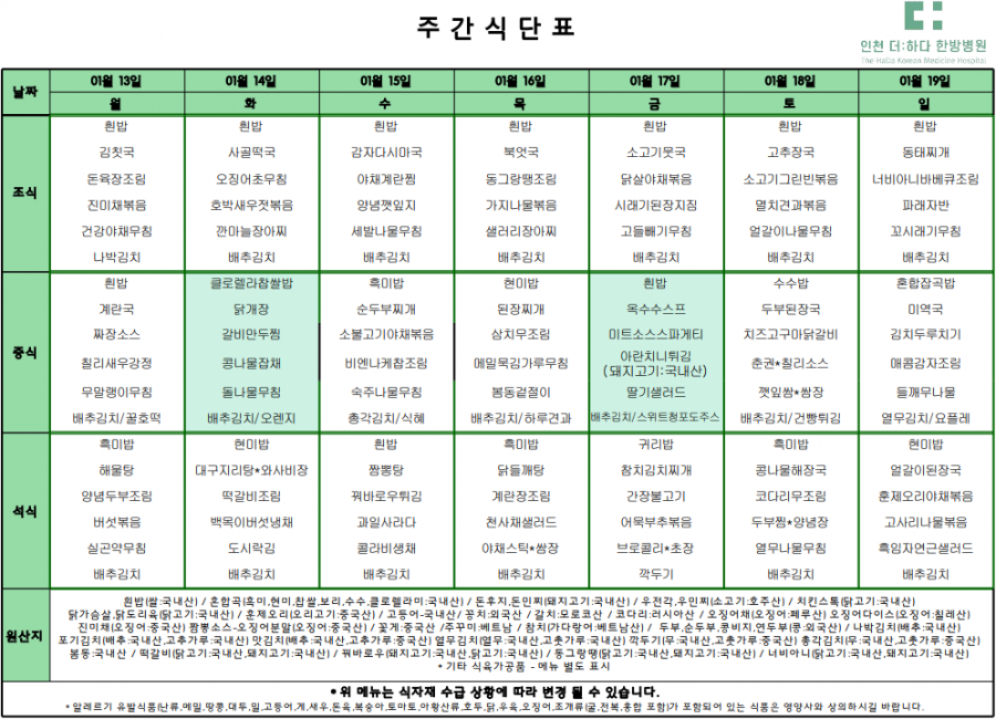 [더하다 식단] 2025년 1월 3주차 식단 작성일 : 2025.01.11 인천더하다한방병원 댓글 : 0 조회 : 506 <인천더하다한방병원 1월 2주차 식단사진> <인천더하다한방병원 1월 3주차 주간식단표>